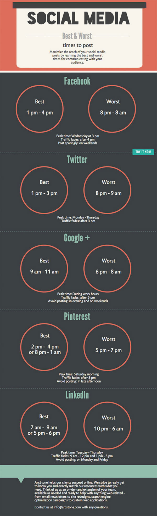 Do you ever wonder why some posts on social media platforms get more traffic than others? Most likely it was due to when the post was published. To help you out, we put together a graph of the best and worst times to post on different platforms.